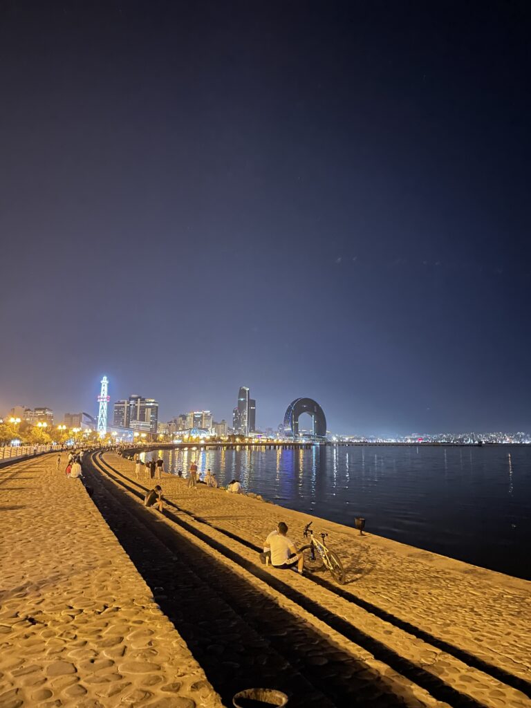 夜景を見るなら、カスピ海沿いの遊歩道から見るのがおすすめ!タワーと海が一緒に写真に収まる。