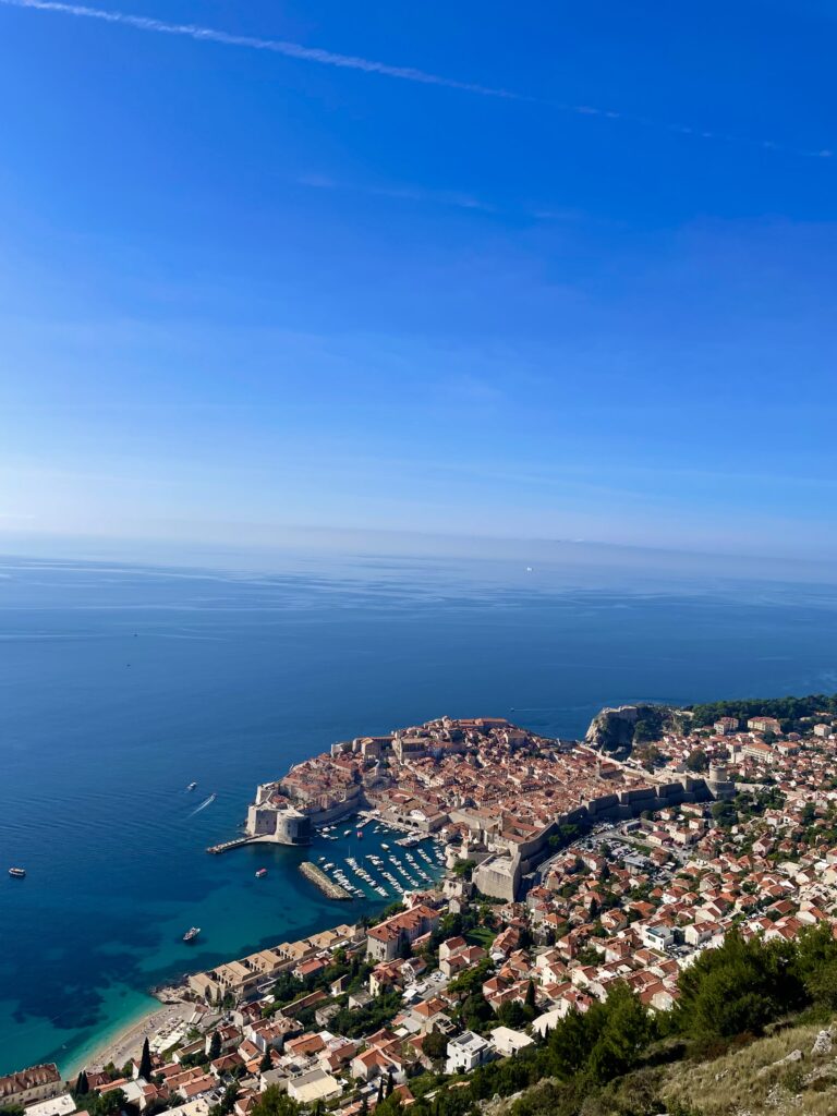 城壁の内側の街、その先に広がるアドリア海、点在するドブロヴニク諸島——全部が一度に見渡せる。