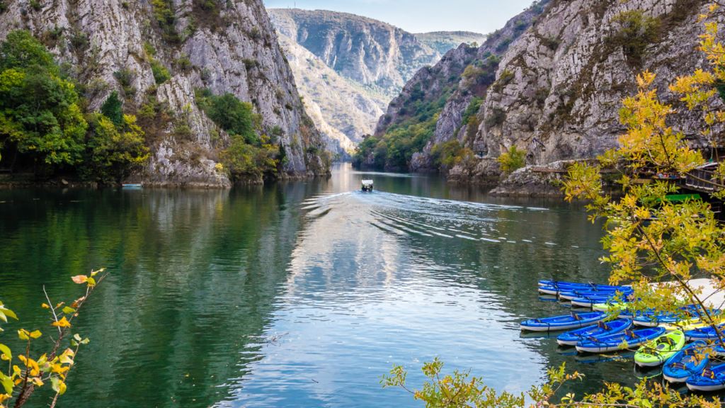 スコピエから車で約30分のところにあるマトカ渓谷は、切り立った岩壁と深い緑色の湖が織りなす絶景スポット。